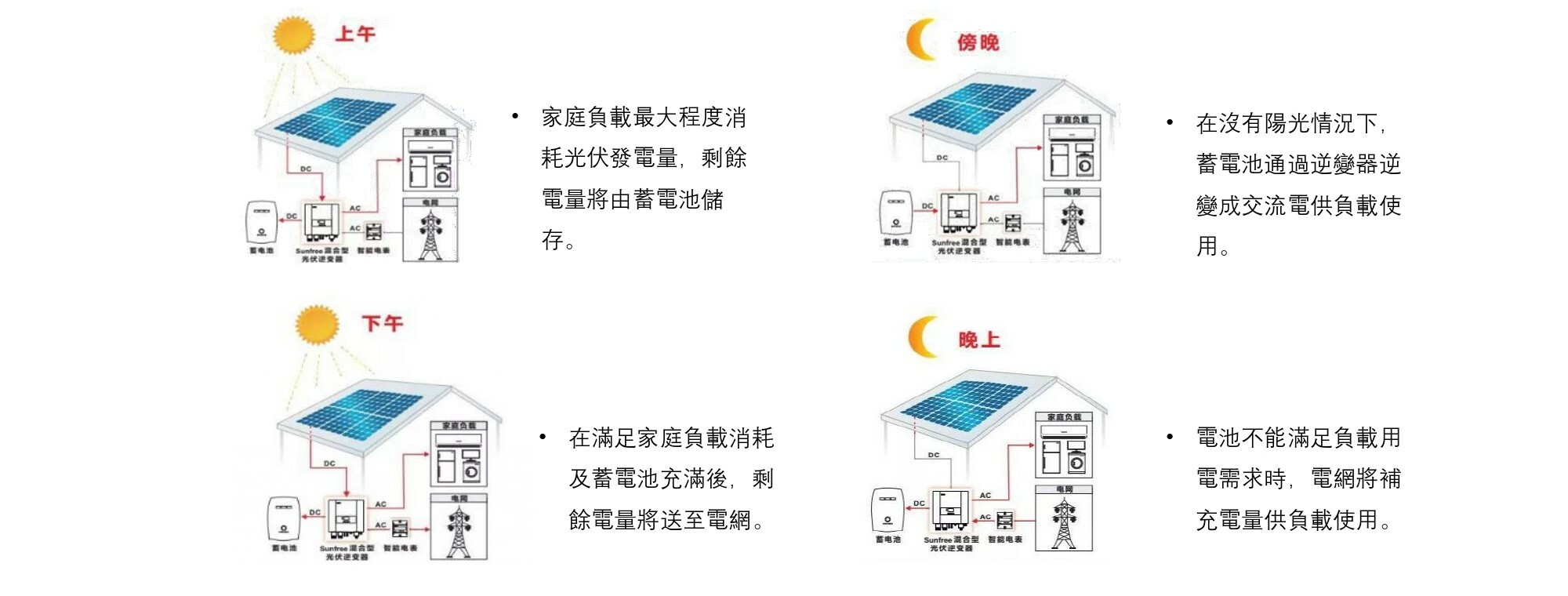 • 特點:當太陽能功率小於負載功率時,系統由太陽能和電網一起供電,當太陽能功率大於負載功率時,太陽能一部分給負載供電,一部分通過控制器儲存起來。