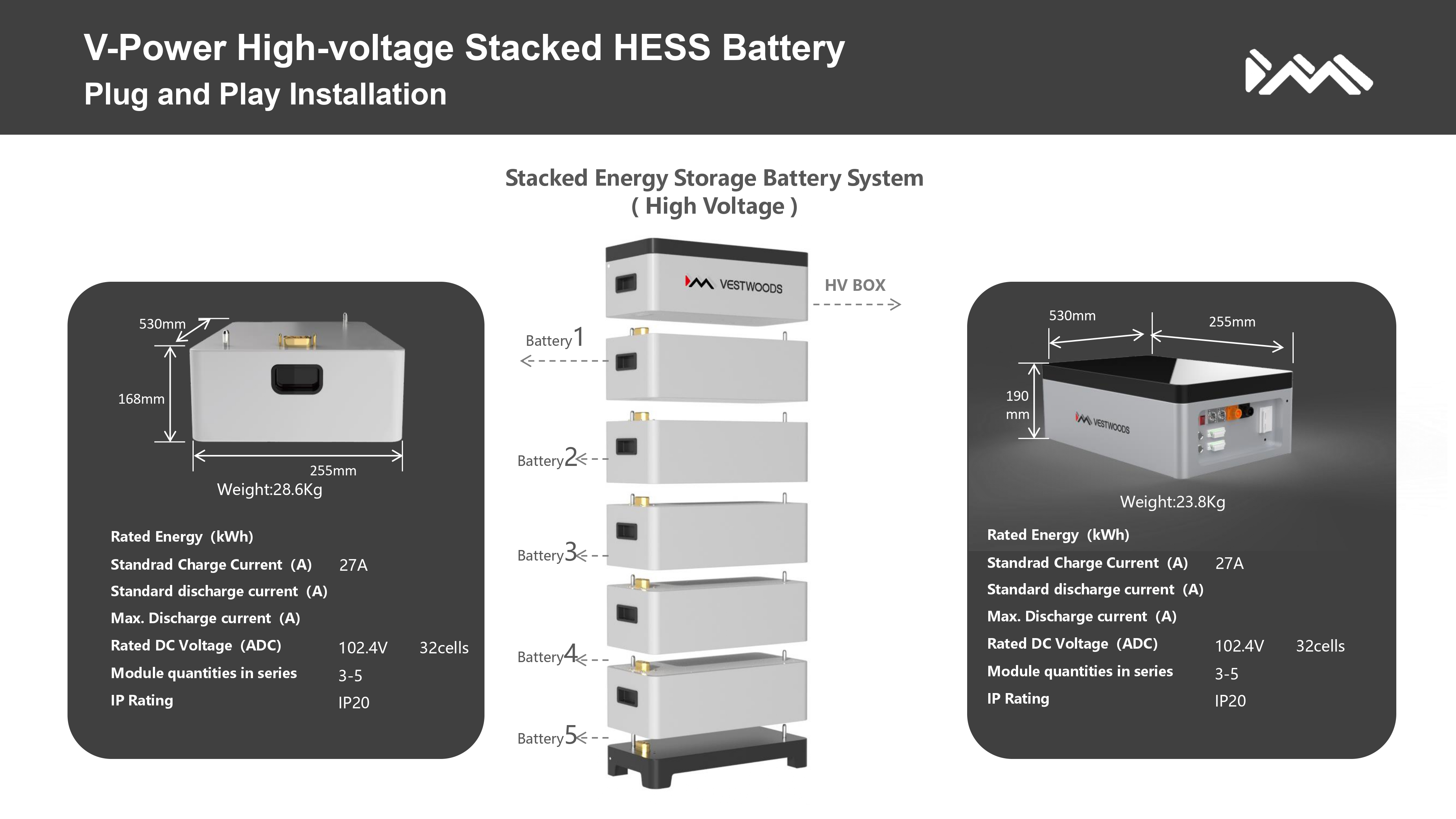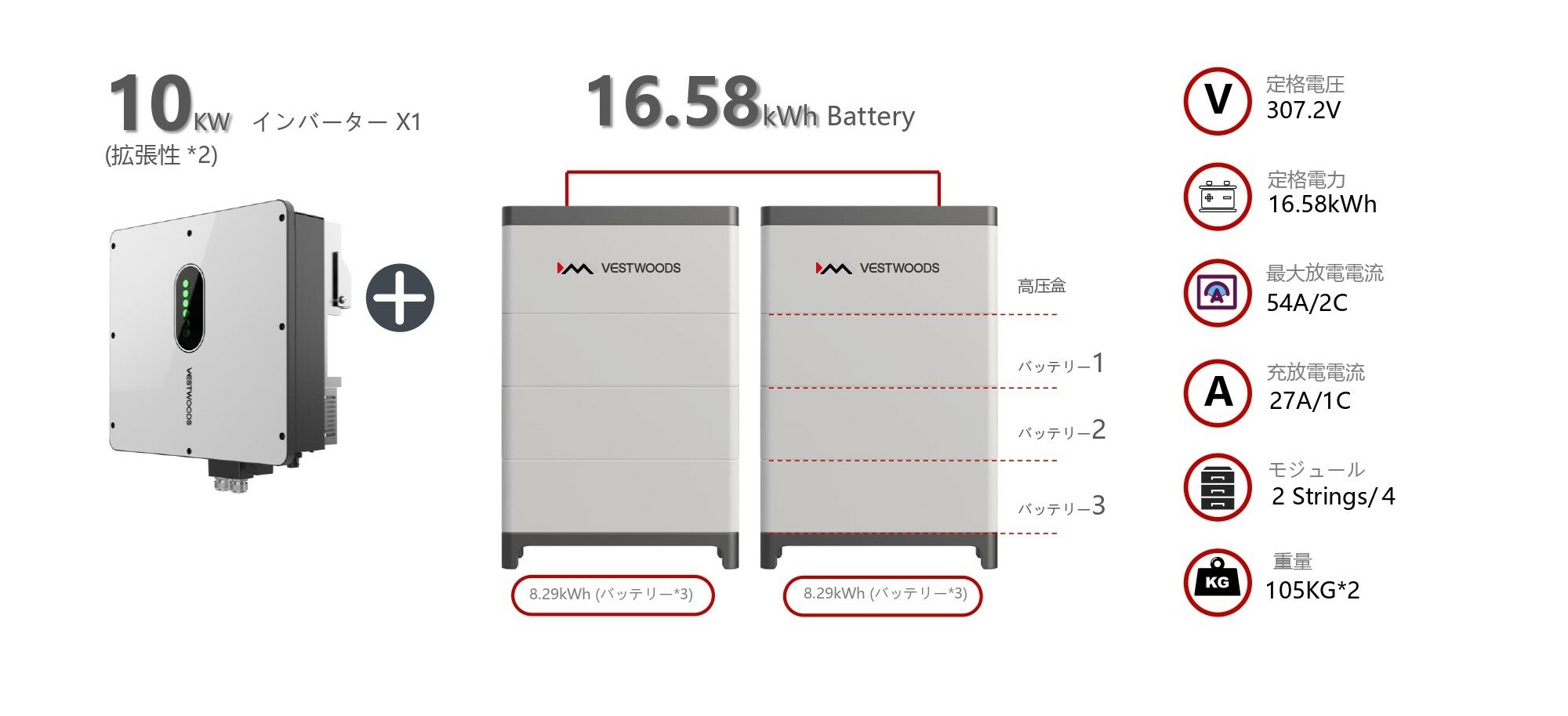 與逆變器分離安裝於家庭中,一體可疊5層電池,即插即用式。